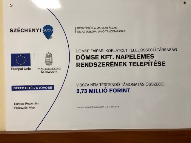 Projekt tartalmának bemutatása: DÖMSE Faipari Kft. Sásd, Hörnyék utca 24. szám alatti székhelyén napelemes rendszert telepített. 44 db QCells QPEAK DUO BLK-G5-310 típusú 310 Wp teljesítményű napelem került beszerelésre 1 db inverterrel. Eredmény: a megújuló energia rendszer névleges termelési teljesítménye 13,64 kWp. A megújuló energiából előállított energia mennyisége 54,0144 GJ/év. A beruházás a CO2 kibocsátást csökkenti, így környezetvédelem szempontjából előnyös a gazdasági előnyök mellett.